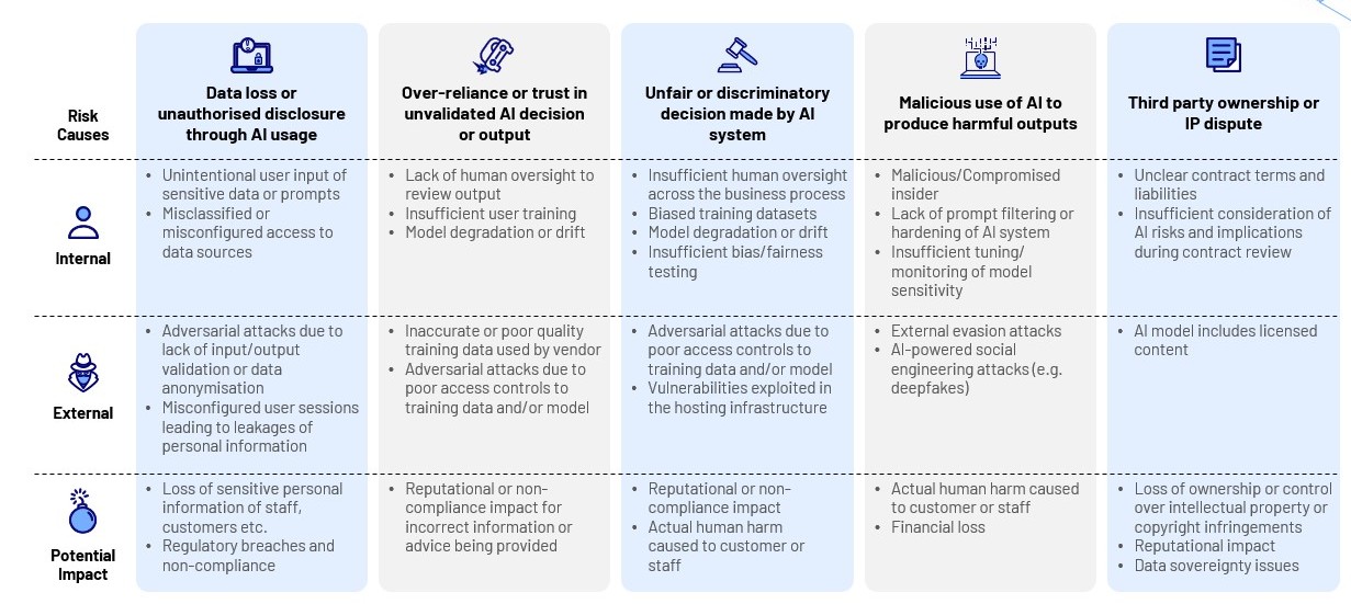 This is not an exhaustive list of what could go wrong with an AI system and new risks are emerging all the time. But these represent the key types of risks that an AI system typically introduces and which can be integrated into an organisation’s existing enterprise risk taxonomy alongside traditional technology and cyber security risks.